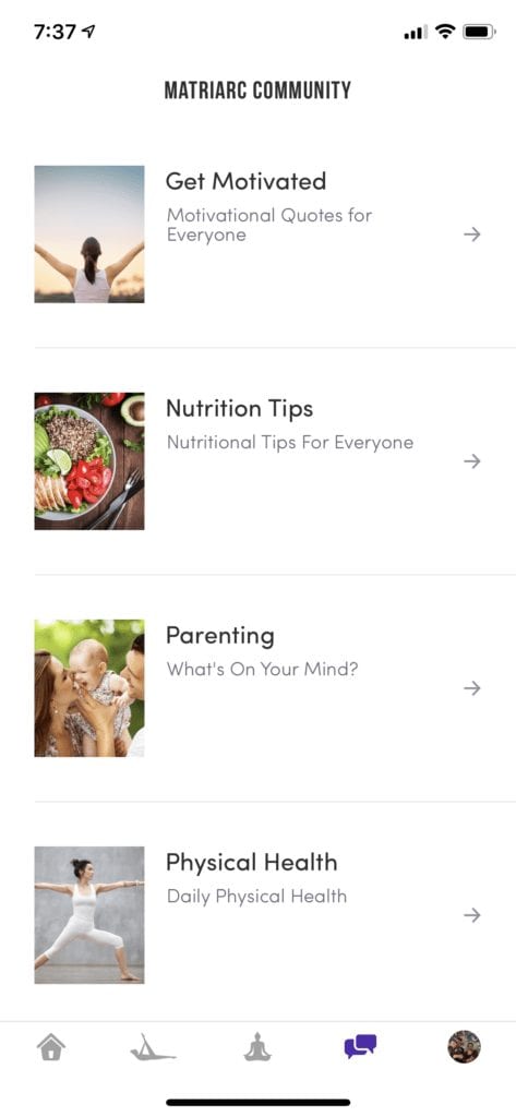 7 Lastly, the Matriarc Community is a section that I think can grow with time and as the app becomes more popular. It is a kind of social scene for the app and mamas who use it. The topics are “Get Motivated”, “Nutrition Tips”, “Parenting”, “Physical Health” and “Support and Community”.
