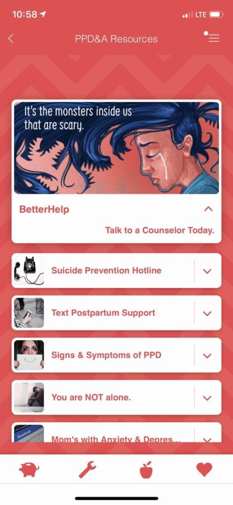 The app features resources, education, and support. Straight from the app, you can talk to a counselor at BetterHelp, call the suicide prevention hotline and text postpartum support line.